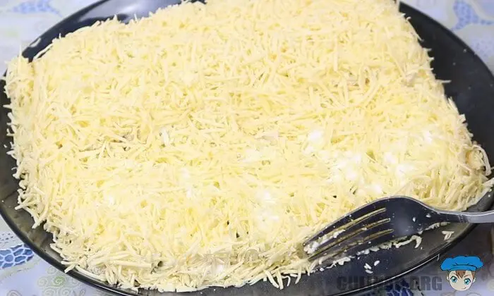 Завершающим слоем будет сырный. Посыпаем натертый сыр по всей поверхности.